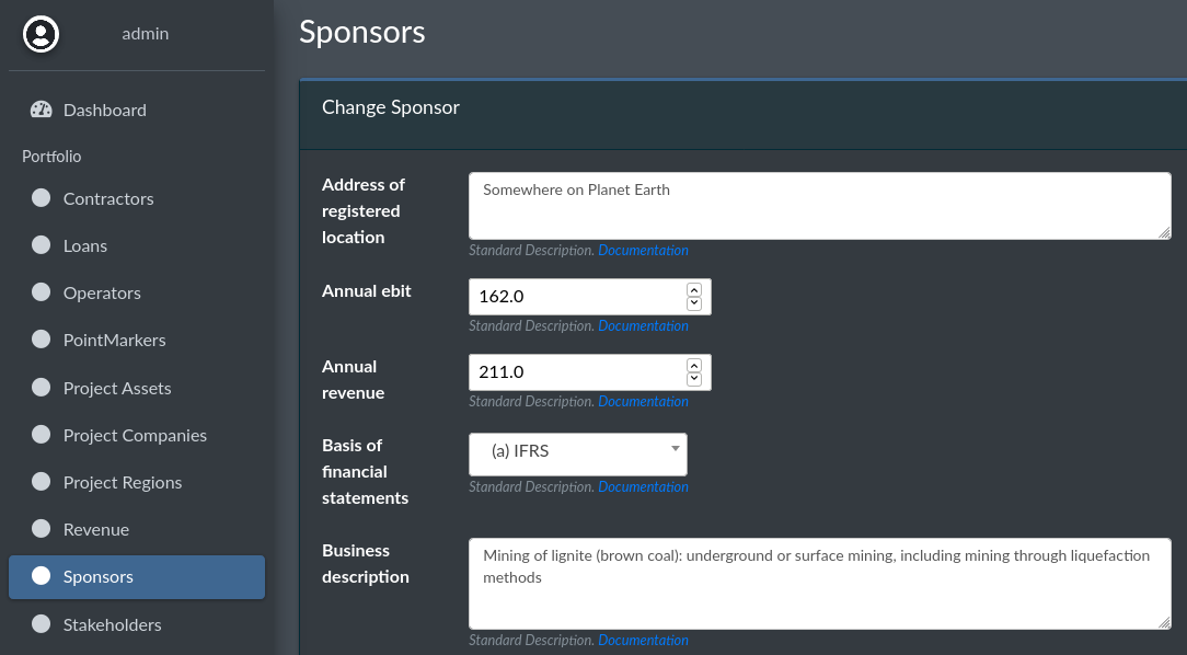 Data entry for numerical or text inputs is via convenient web forms. For example a segment of the Sponsor information: